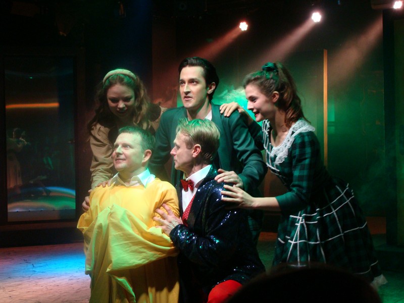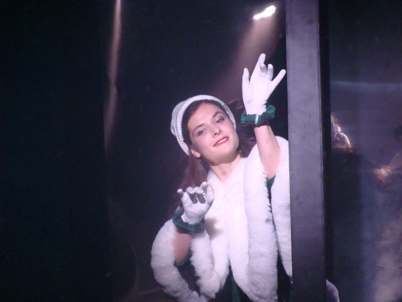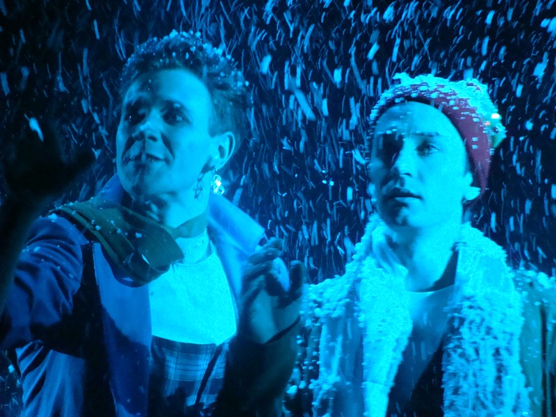 Завораживающе прекрасно решена в постановке Олегом Леушиным сцена на катке на Чистых прудах! Пары скользят по условному льду, играют замечательные мелодии, мелькают костюмы – скромные, в духе времени (яркая стилизация от художника Ольги Ивановой). На заднем плане горят новогодние огоньки, а сверху валит настоящий снег (на сцене работает снегомашина). Воспоминания, как и падающие на головы хлопья, буквально накрывают нас с головой…