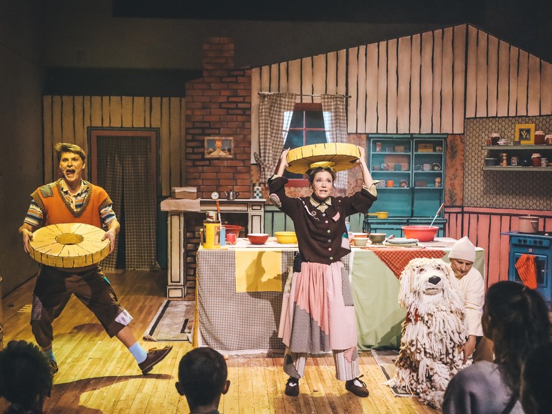 Спектакль полон ожидания рождественского чуда. Сцена наполняется волшебством: обычные кухонные предметы оживают, мука превращается в снег, а елочная гирлянда загорается еще в лесу, предвосхищая праздник.