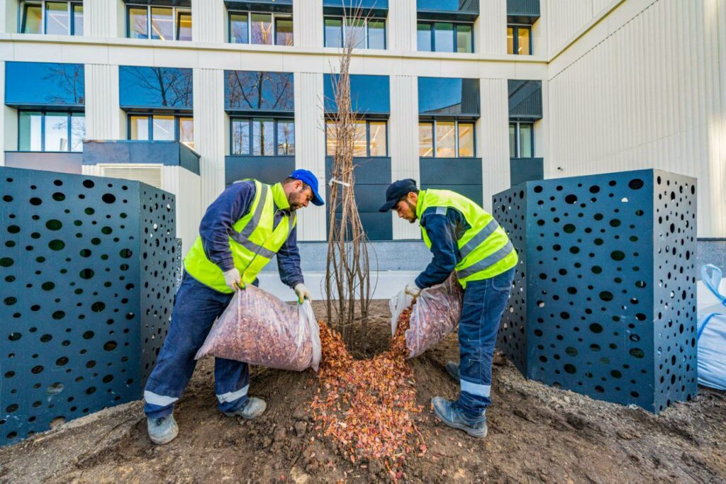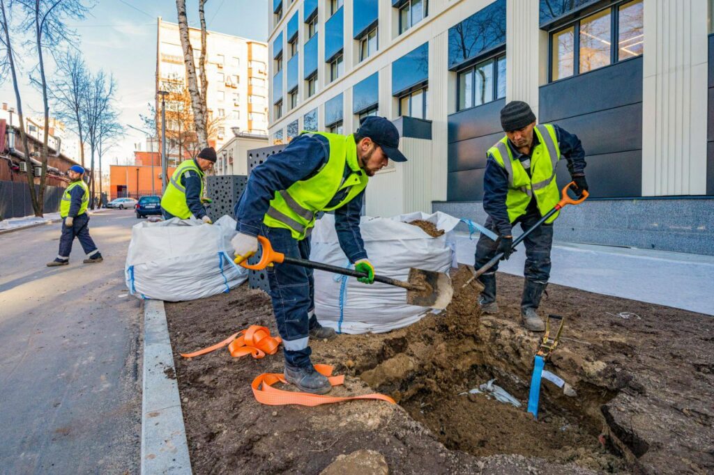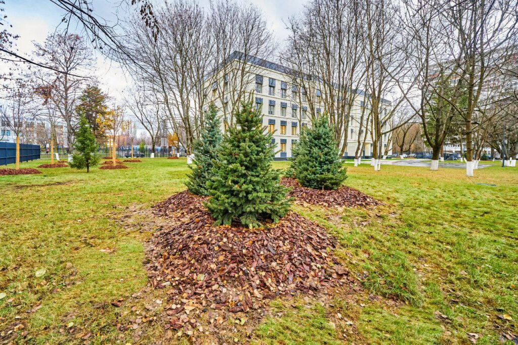 Высадка деревьев производится в заранее подготовленные посадочные ямы с плодородным грунтом и дренажным слоем, который защищает корни от гниения и обеспечивает необходимую вентиляцию.