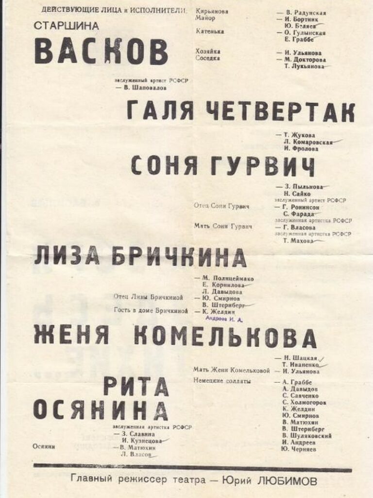 В январе 1971 года Московский театр на Таганке представил спектакль по произведению Бориса Васильева «А зори здесь тихие…». Когда он закончился, аплодисментов не было, люди, потрясенные, молча выходили из зала.