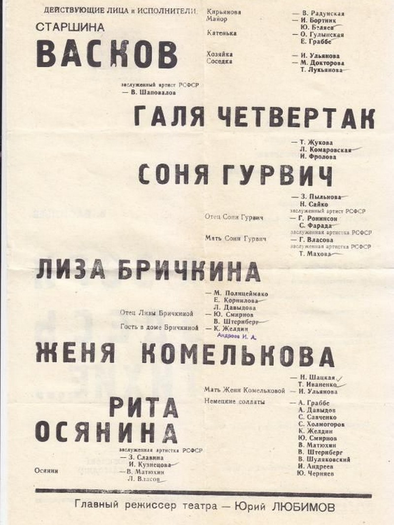 Однажды на постановку «А зори здесь тихие…» пришел актер театра и кино, педагог Алексей Николаевич Грибов. После окончания спектакля он долго не хотел уходить из кабинета Юрия Любимова. Один из старейших мастеров Художественного театра плакал, всплескивал руками и то восхищался увиденным, то ругал себя… за доверчивость к слухам о «Таганке»: «театр режиссера», «театр без актера», «формалисты» и так далее. Как, мол, он сам мог поддерживать хулу, не проверив своим опытом! А вот сегодня он потрясен и слов найти не может…