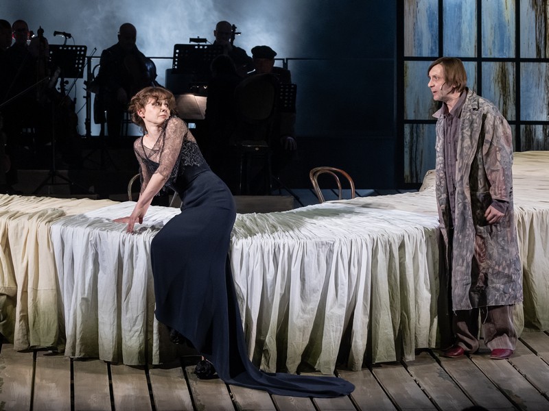 Ситуация метафорически подчеркнута длинным столом, змеящимся через всю сцену (сценография Марии Митрофановой). Стол балансирует на наклоненной в сторону зала поверхности сцены, будто бы рискуя съехать на зрителей. Покрывающая его скатерть создает ощущение несвежести, намекая на сомнительность чистоты любовных порывов людей, которые к тому же постоянно перелезают через него туда и обратно. На доли секунды застывая на его поверхности, они напоминают парадные блюда, которые зритель разглядывает с изумлением, узнавая в персонажах себя.