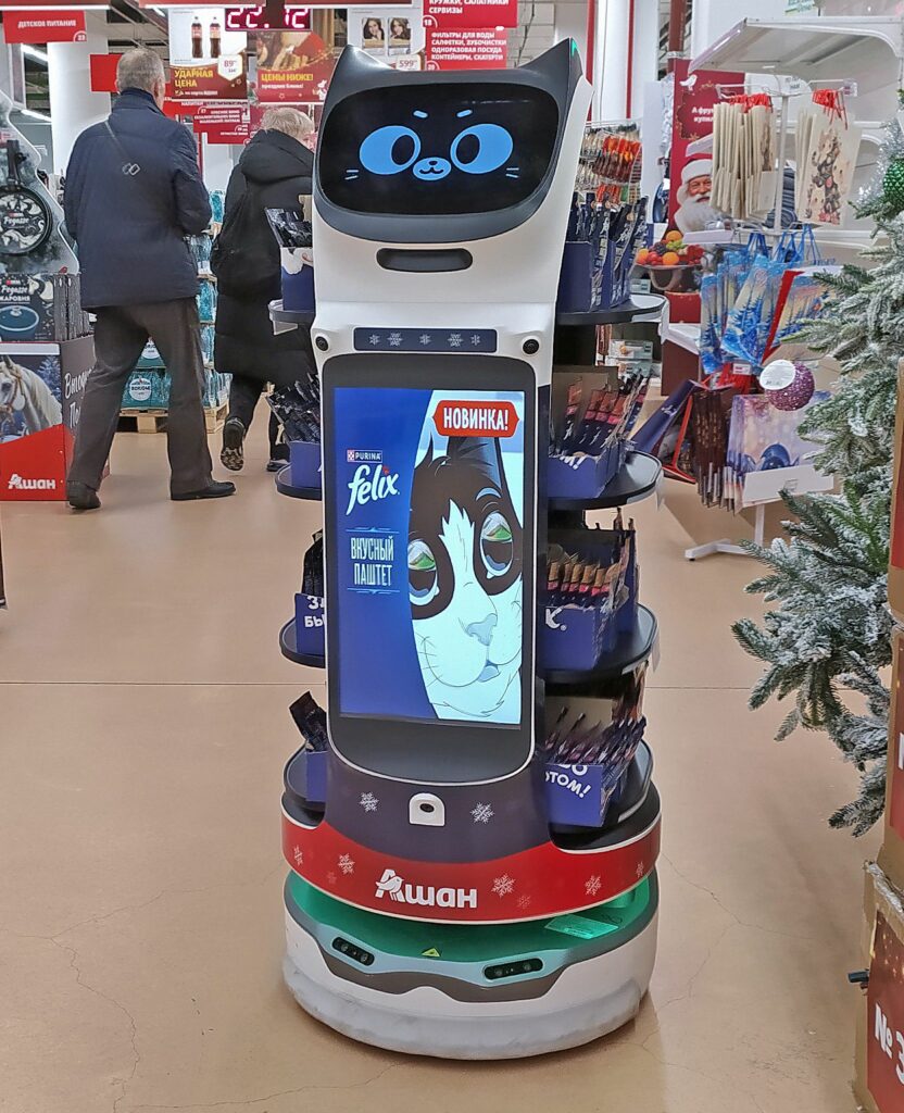 Но не так давно в этой суете появились новые сотрудники – удивительные создания, милые и необычные. Они заигрывают с покупателями, предлагая всевозможные товары, кокетливо подмигивают, поводят усами, строят умильные мордочки и заливаются мелодичным мурлыканьем. Эти работники – роботы, воплощенные в образе пушистых котиков, а кто же не любит котиков? Роботы-котики выступают в роли «живой» рекламы, грациозно скользя по залу. Которобот обучен ловко объезжать препятствия, вежливо уступая дорогу посетителям, с точностью до сантиметра маневрируя между стеллажами, словно опытный капитан среди коралловых рифов. У этого чудо-продавца вместо лапок – четыре изящные полочки, на которых красуется товар: конфеты, соки, лакомства для живых собратьев. Этот мурлыкающий «продавец» всегда весел, не знает грубости и не вступает в споры, одаривает покупателей пожеланиями хорошего дня и не забывает рассказать о предлагаемых сокровищах, создавая вокруг атмосферу непринужденной доброты и уюта.