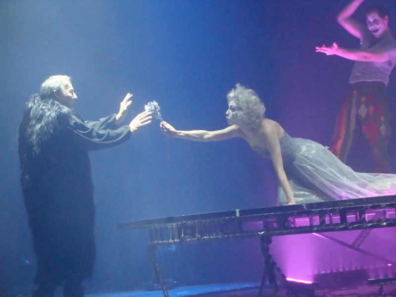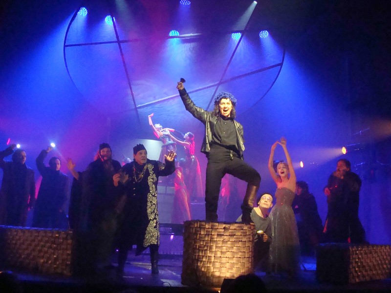 Технически это сделано благодаря большой вращающейся, неравномерно вздыбливающейся, ходящей ходуном круглой платформе под ногами Гамлета. На ней разворачиваются основные события. Принц все время вынужден балансировать и попутно искать ответы на главные вопросы бытия, принимая решения в одиночку. Правильные или неправильные – но эти решения должны быть найдены. Это его и тяготит.