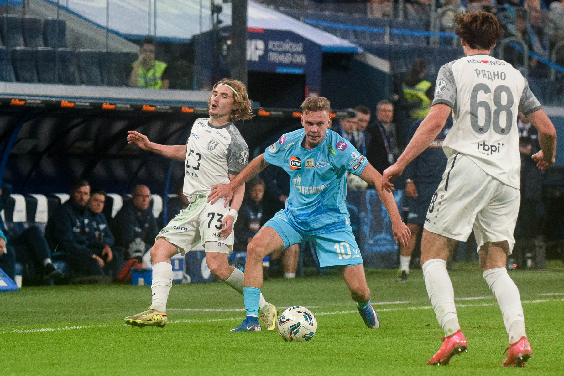 Тренер калининградцев Талалаев наблюдал над мучениями «Зенита» с трибуны. Его подопечные без особого труда разрушали немногочисленные подходы к воротам (атаками это точно назвать нельзя) хозяев поля, которые, не стесняясь, перекатывали футбольный снаряд поперек зеленого прямоугольника.