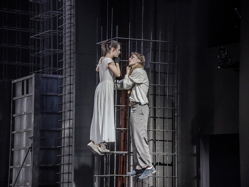 Индустриальный стальной пейзаж, частично возведенные бетонные серые колонны, голые стены в каркасе арматуры с торчащими вверх металлическими прутьями – таков антураж шекспировского спектакля. Ни тебе изящных балкончиков Вероны, ни ее тенистых садиков перед особняками, ни белокаменных мраморных лестниц с фонтанами.
