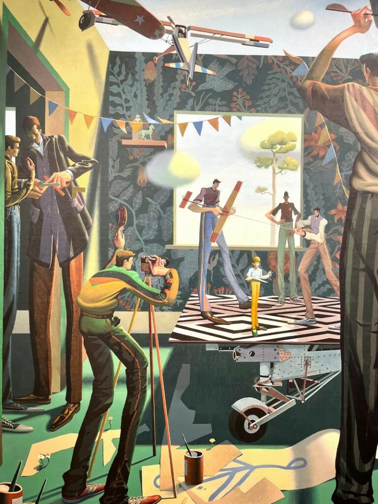 Модный пожилой мужчина в широких джинсах ходит по выставке, фотографируя почти каждую работу. В очередной раз он останавливается у экспоната и внимательно рассматривает небольшой чемоданчик с росписью.