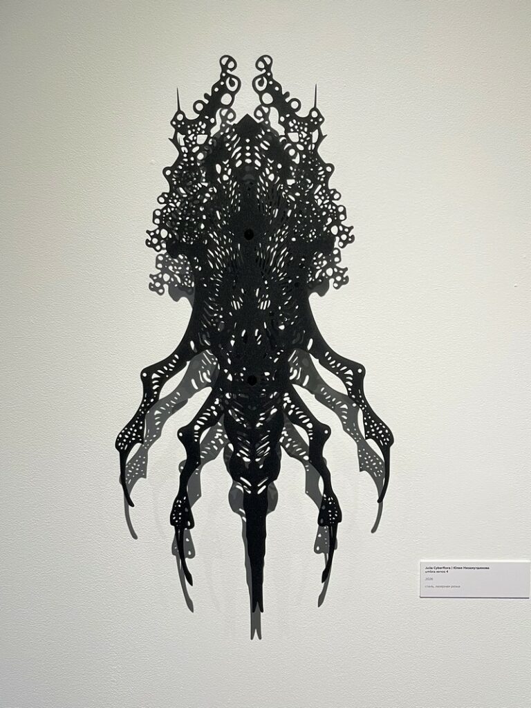 В экспозиции представлены еще две серии работ Юлии Низамутдиновой. Очередная форма «иного», обитающего, возможно, и на планете Земля, заключена в «Umbra Xenos» – черных арт-объектах из стали. Эти существа своими чертами подобны то ли моллюскам, то ли ракообразным, то ли чернильным пятнам из теста Роршаха. Созданы они были в процессе своеобразного реверс-инжиниринга как с помощью классических инструментов, так и текстовых промптов нейросетей. Их увлекательно рассматривать вблизи, как и третью серию работ художницы под названием «Crypto Invaders».