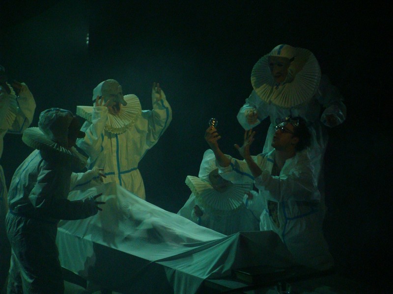 Атмадзас до краев насытил пространство различными «философскими» атрибутами бытия: тут и груда черепов, и деревянный гроб, и золотой песок, сыплющийся с небес, и искусственный человек – гомункул, и огромный стол, на котором Фауст проводит свои опыты. Даже есть символический колодец, у которого женщины наполняют ведра и регулярно перемывают косточки своим соседкам.