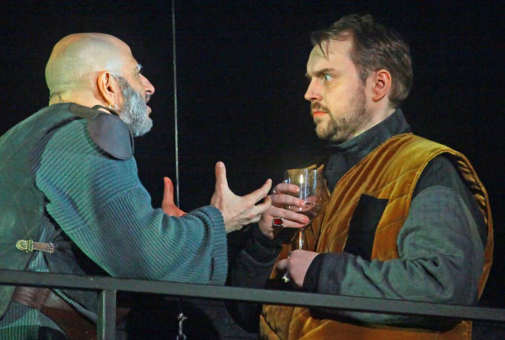 Весьма необычны костюмы: художница Маша Небесная (она же видеохудожник) придумала многослойные наряды, которые переосмысляют исторический крой, фиксируют диалог времен и становятся метафорой отношений между шекспировскими персонажами. Многослойность, традиционные стеганые акетоны и подлатники воплощают метафору холода между близкими людьми, желание отгородиться, невидимую вражду, напряжение и готовность к войне, а исторические элементы, формы воротников, специфическая обувь помогают актерам найти и проявить пластику персонажа.