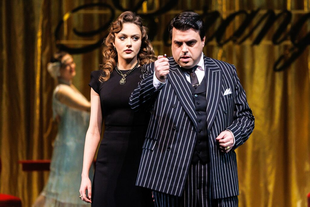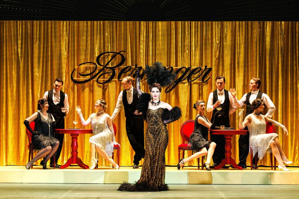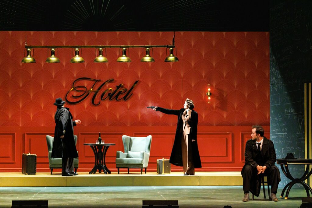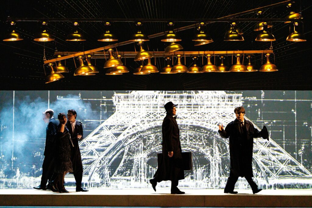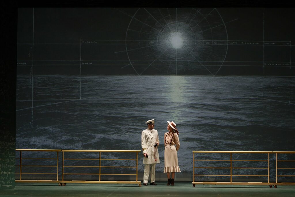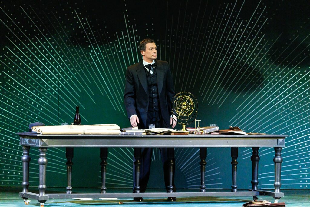 Художник-постановщик Мария Шуплецова создает символичную декорацию: коробка сцены распахнута в сторону зрителей, как некий драгоценный «ларец», опрокинувшийся на бок. Из центра этого «ларца» в разные стороны по его стенам расходятся лучи гиберболоида, постепенно превращающиеся в едва различимые глазом физические формулы. Периодически задник «ларца» исчезает, впуская зрителя в смежные пространства: мы то оказываемся в Париже с неизменной Эйфелевой башней на горизонте, то в центре Венеции с ее соборами и каналами. Попадаем на борт корабля, бороздящего морские просторы, переселяемся вслед за героями в Неаполь. Лаборатория Манцева на глазах зрителей превращается в холл французской гостинцы, а потом и в бар, где так любят собираться русские эмигранты.