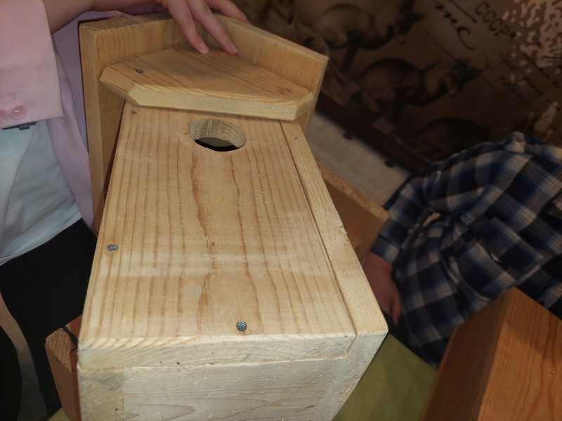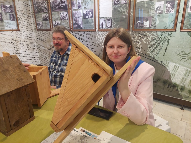 Интересно стало уже в начале – между гардеробом и лестницей раскинулась выставка скворечников. Старший научный сотрудник Геннадий Курилин охотно дает пояснения. И они, мягко говоря, озадачивают.