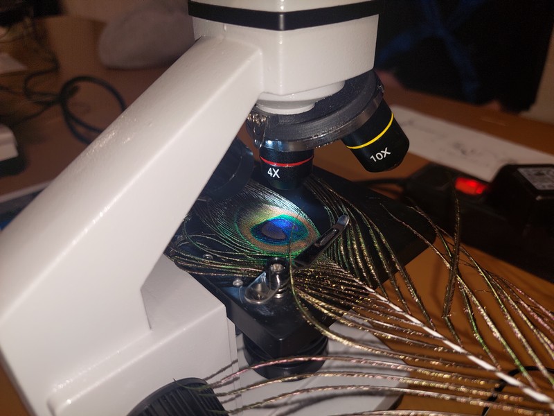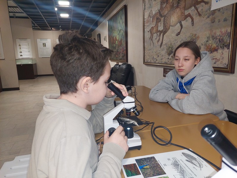 В соседнем зале можно разглядеть в микроскоп птичьи перья. Самое великолепное, конечно, – павлинье перо. В окуляре микроскопа оно кажется россыпью драгоценных камней.