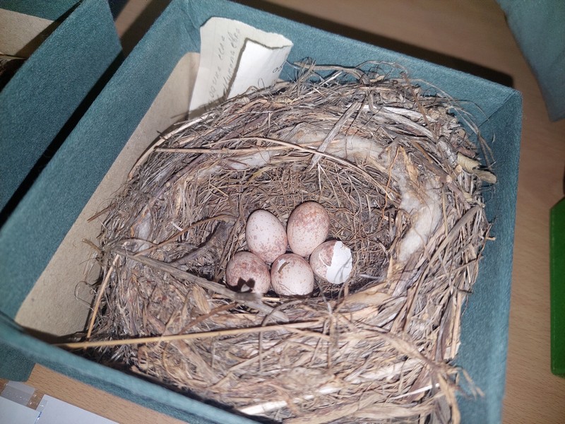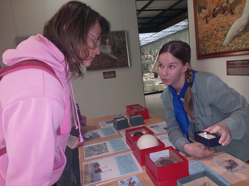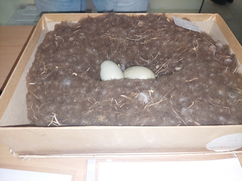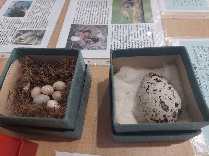 В следующем зале лежат птичьи гнезда. Аккуратная чашка дрозда – в сказках он выступает как самый искусный гнездостроитель в мире птиц. Чашка сплетена из прутьев и тщательно вымазана изнутри грязью. В сказках дрозд учит других птиц вить гнезда, а в реальности, возможно, именно он научил наших предков делать глиняную посуду методом «обмажь корзину и сунь в огонь, прутья сгорят, глина останется». Рядом в коробочках лежат яйца: темное воронье, большое белое яйца страуса – самое большое в современном мире. Рядом пестрое яйцо эму. И завершает экспозицию роскошный плот из мягкого пуха, в котором покоится яйцо гаги.