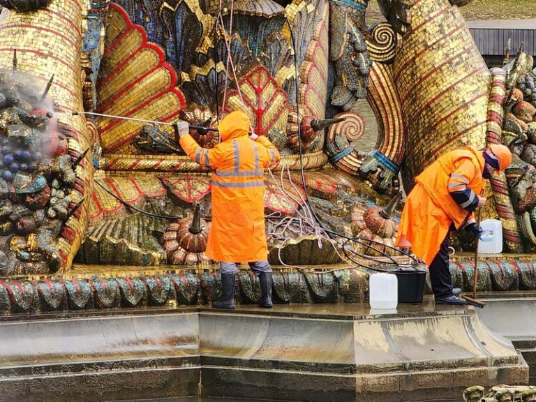 Фонтаны на ВДНХ промывают вручную, так как сложные архитектурно-художественные сооружения с большим количеством декоративных элементов требуют бережного ухода.