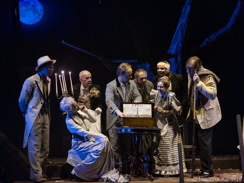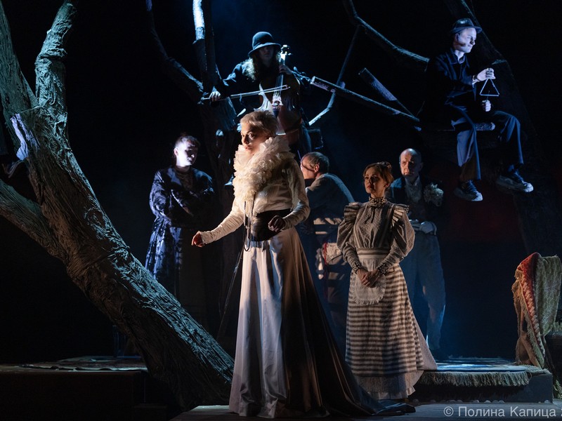 Сад в спектакле художника-постановщика (за декорации отвечал сам Грымов) – вполне живое существо. Раскидистые вишневые деревья благословенно посыпают чеховских старыми листочками и ждут решения своей участи. В ветвях запуталась круглая луна, вносящая в действо ностальгическую мелодию. В ветвях гудит ветер и притаилась музыка прошлого.
