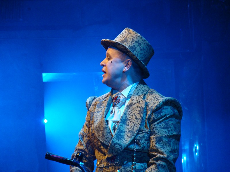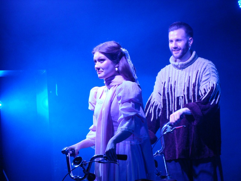 Все они передвигаются пешком или на огромных трехколесных велосипедах. Мелькают ажурные зонтики, карнавальные маски, дорожные саквояжи. Созданные художницей Эльвирой Семеновой костюмы завораживают огромным количеством «вкусных» деталей: женские сапоги-ботфорты соседствуют с легкомысленными рюшечками на платьях, а цилиндры и шубы – со стильными вязаными свитерами. Различные эпохи и стили смешались тут в одном большом карнавале, дабы донести идею, что рассказываемая история актуальна во все века, она вне времени и пространства.