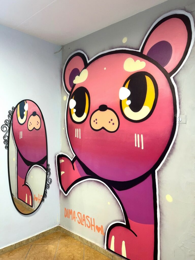 Попав на его территорию, оказываешься в многоэтажном творческом лабиринте андеграунда, который пестрит артами. Искусство разных авторов находишь на каждом лестничном пролете, на каждом этаже. В этом пространстве поверхностью для работ становится даже потолок, квадратные плиты которого расписаны в разнообразной стилистике.