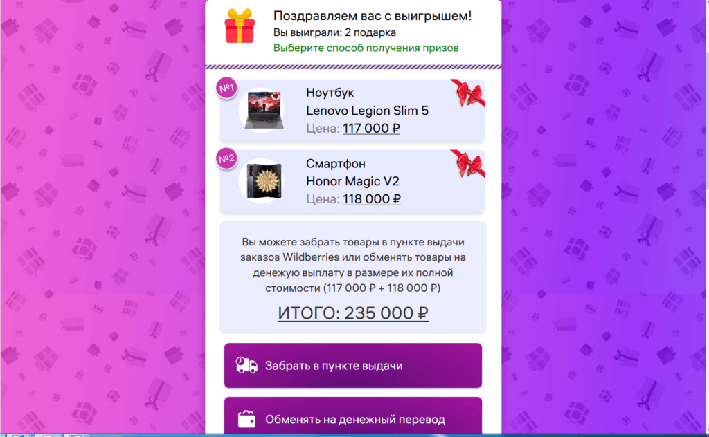 На сайте предлагается крутить барабан. Вроде бы все как в обычных розыгрышах – дается ограниченное количество попыток, то пустышка выпадет, то дополнительные попытки. Среди призов мелькают ершики для унитазов, кухонные комбайны и паровые швабры. Но выпало и два приза. Крупных! Ноутбук и смартфон. На общую сумму 235 тысяч.