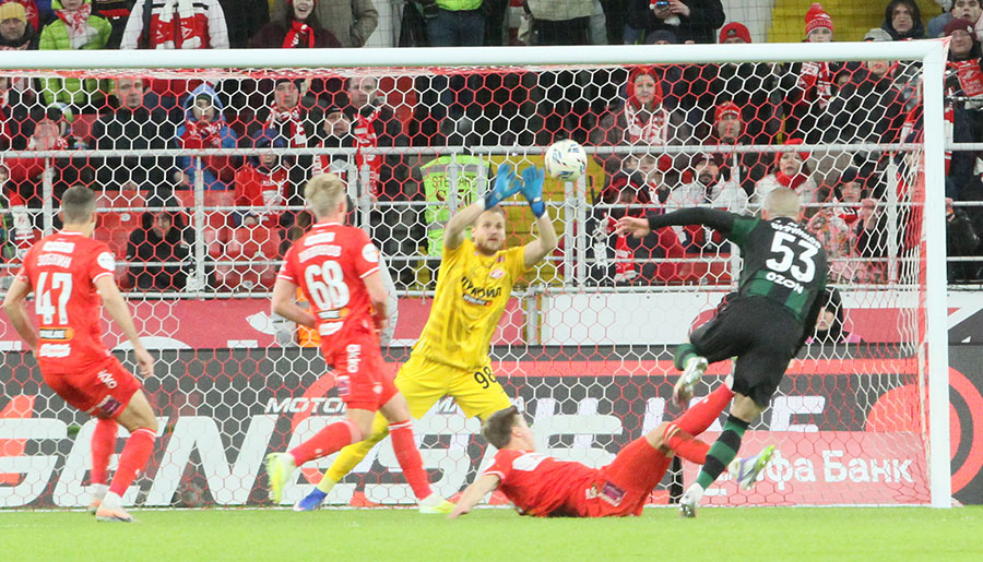 «Спартак» создал за первые 45 минут два момента. Сначала Барко убежал в контратаку, отдал пас на Маркиньоса, который влетел в штрафную и с левого фланга пробил почему-то не в ворота, а в Агкацева. Перед самым перерывом после удара Литвинова мяч рикошетом от бедра Мартинса оказался в воротах гостей.