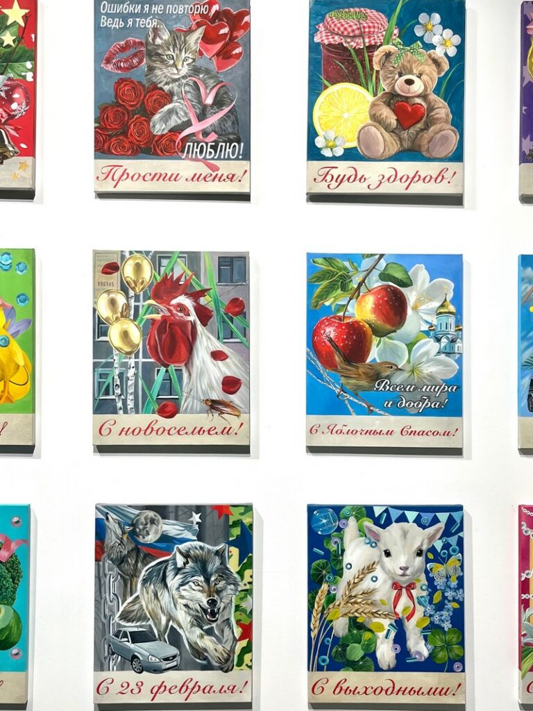 Встречает посетителей серия работ, выполненная маслом на холсте. Это знакомые всем виртуальные открытки, с помощью которых мы выражаем эмоции, поздравляем с праздниками в социальных сетях. В процессе непрерывного воспроизводства они лишаются первоначальной ценности. Автор работ Ника Хахаева возвращает им материальность.