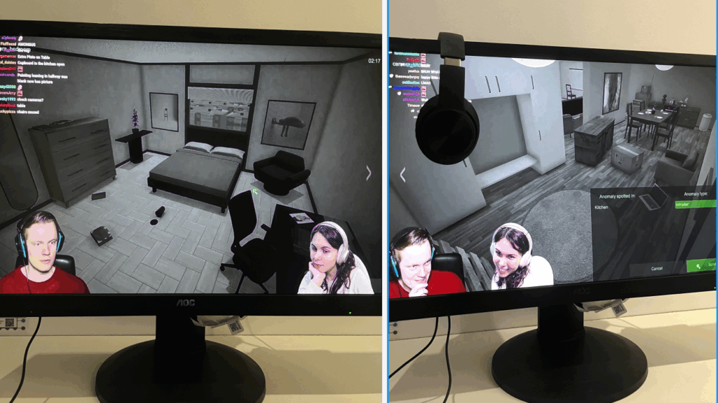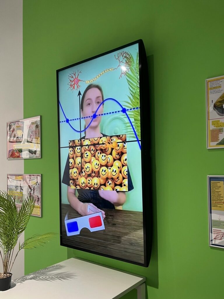 Чуть дальше расположился необычный зал, посвященный проектам в формате компьютерных игр. На одном из компьютеров идет трансляция прохождения хоррор-игры. Поначалу девушка находится в противоположном углу от стримера, но затем придвигается все ближе и ближе.