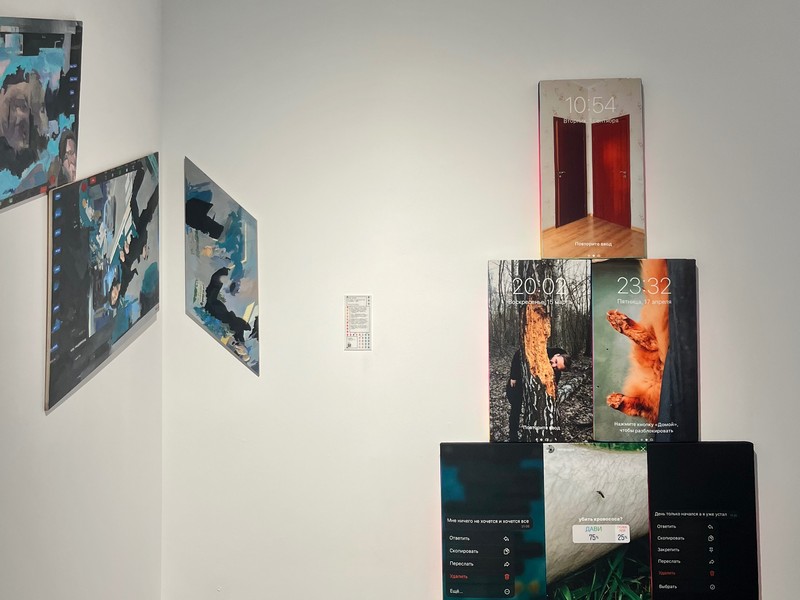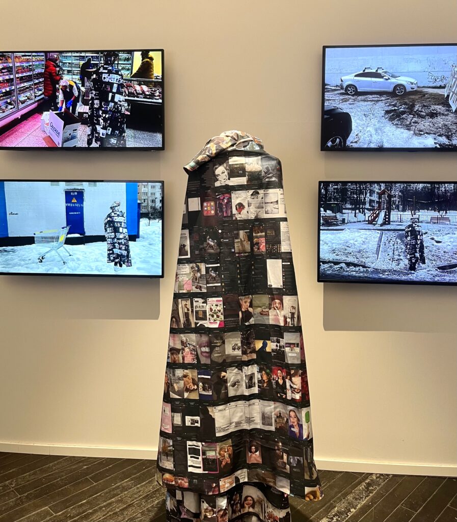 Среди инсталляций на выставке есть и плащ, каждый лоскут которого стал отображением контента, потребленного художницей Алиной Лоскутовой за несколько недель. Скриншоты с ленты новостей, переписок, изображения стали своеобразным укрытием. Рядом – экраны, где человек в этом самом плаще вписан в повседневную среду: магазин, детская площадка… «Работа обращается к опыту существования внутри информационного потока. Наслаивая на себя этот поток, человек стремится защититься – скрыться от внешнего мира… Однако это укрытие оказывается парадоксальным: чем плотнее слой контента, тем сильнее дистанция от реальности», – сказано в описании.